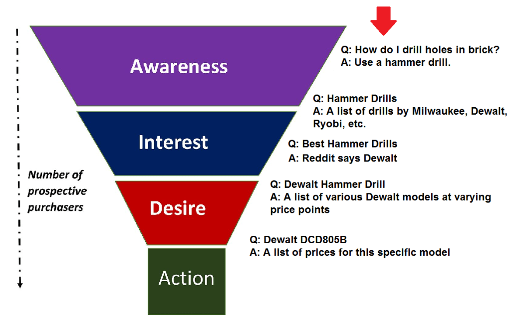 Now, imagine you are about to embark on a home improvement project and need to drill a series of holes into your home’s brick exterior. You are a newbie, so you must first perform research via Google and YouTube to learn the technique. Please take a look at the augmented funnel graph below where I illustrate the progression of search phrases as our DIY searcher moves through the purchase funnel.