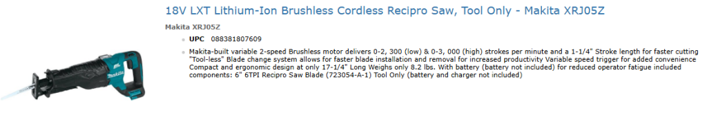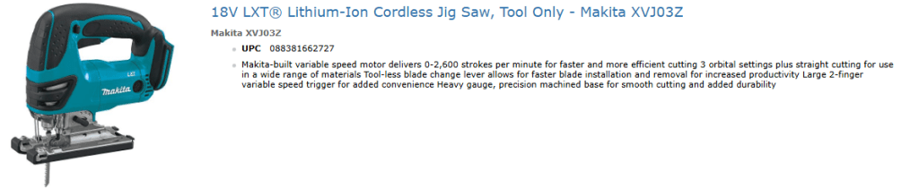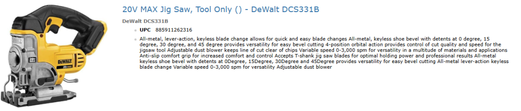 Note how the second jig saw has similar wording for product type. The LLM has expanded 20V to “20 volts.” The power type of “tool only” is interesting but not completely incorrect. This item does NOT have a battery, so it has no power source!