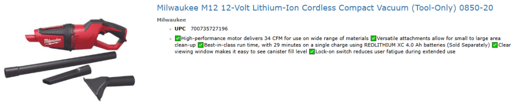 "title": "Milwaukee M12 12-Volt Lithium-Ion Cordless Compact Vacuum Tool-Only 0850-20",